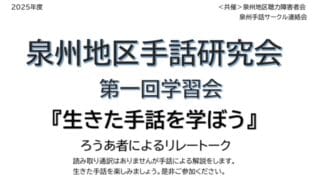 情報共有7/13(日) 泉州地区手話研究会 第一回学習会のお知らせ 泉州手話サークル連絡会からのお知らせになります。 詳細は下図のとおりです。 2025年度泉州地区手話研究会 第1回学習会 2ダウンロー 2025.06.15情報共有