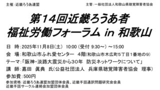 情報共有11/8(土)「第14回近畿ろうあ者福祉労働フォーラムin和歌山」の案内 大聴協事務局からの情報です。『第14回近畿ろうあ者福祉労働フォーラムin和歌山』案内がありました。詳細は下記のチラシをご覧ください。 第14回近畿ろうあ者福祉労働フォーラム案内ビラ(大聴協用ダウンロード 2025.10.21情報共有