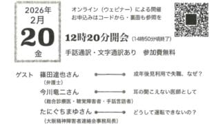 情報共有「障害者の欠格条項をなくす会」より 大聴協事務局からの情報です。「障害者欠格条項をなくす会」より、添付の通り、シンポジウムの案内をいただきました。ろう医師の今川竜二さんも講演をされます。無料のオンラインイベントですので、関心のある方はぜひお申し込みください。 20260226... 2025.12.15情報共有