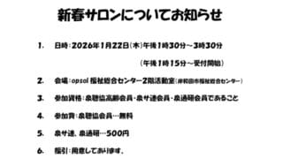 情報共有1/22(水) 新春サロンのお知らせ 泉州地区聴力障害者協会高齢部から新春サロンのお知らせです。申込締切は、1月10日(土)までとなっております。 詳細は下図のとおりです。 2026新春サロンダウンロード 2025.12.19情報共有