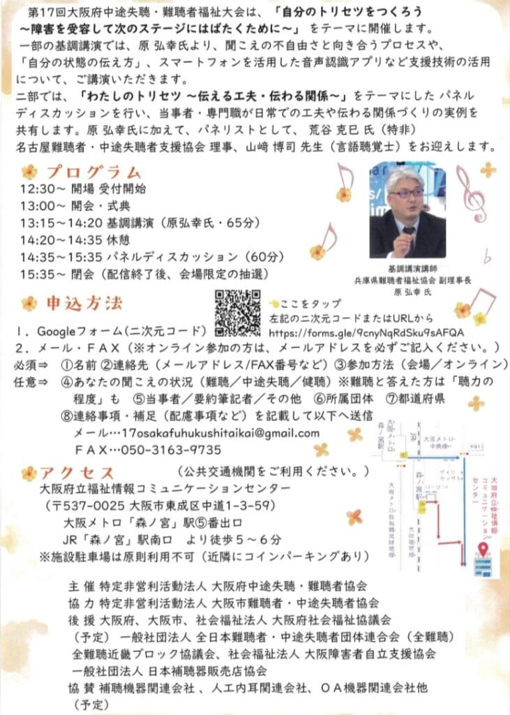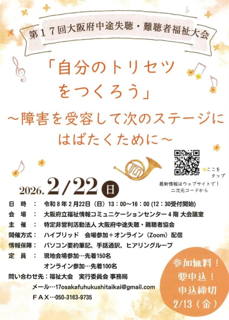 情報共有大聴協2/22(日) 第17回大阪府中途失聴・難聴者福祉大会のお知らせ 情報共有Screenshot2026.01.15大聴協事務局からの情報です。第17回大阪府中途失聴・難聴者福祉大会のお知らせです。20260222難聴者大会ダウンロード