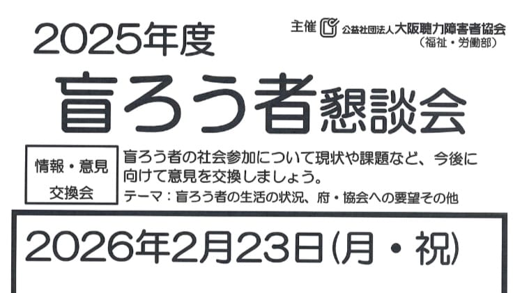 情報共有大聴協2/23(月・祝) 盲ろう者懇談会(大聴協) 情報共有Screenshot2026.01.27大聴協事務局からの情報です。福祉•労働部の懇談会のお知らせです。詳細は下記のチラシをご確認ください。20260223盲ろう者懇談会ダウンロード