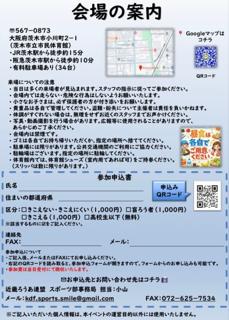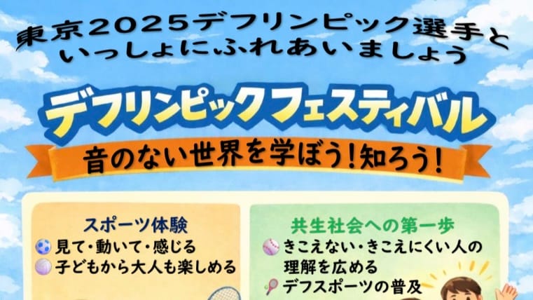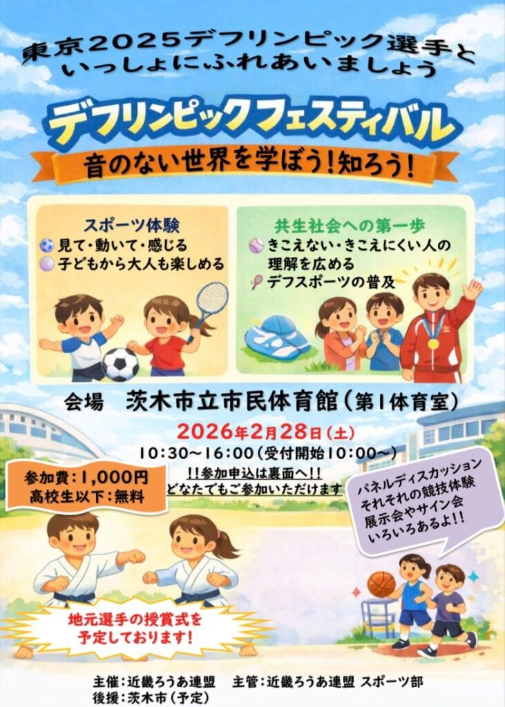 情報共有デフスポーツ2月28日(日)デフリンピックフェスティバル 情報共有Screenshot2026.01.28大聴協事務局からの情報です。2月28日(日)、茨木市立市民体育館にて開催するデフリンピックフェスティバルチラシです。近畿ろうあ連盟主催近畿ろうあ連盟スポーツ部主管参加費1,000円 ※高校生までは無料2月28日近畿ろうスポーツ部デフリンピックフェスティバル_チラシフォーマットダウンロード