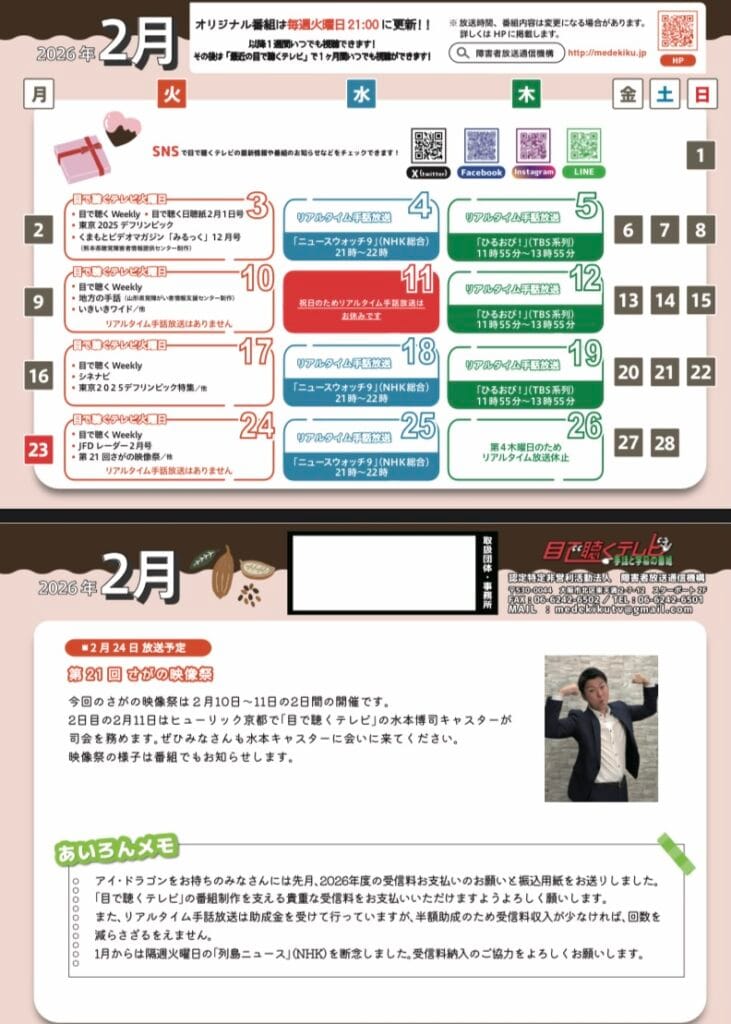 情報共有目で聴くテレビ目で聴くテレビ〈2月〉 情報共有2026.02.05大聴協事務局からの情報です。目で聴くテレビ番組表2月号です。ブラウザーをアップデートしてください2026-2月番組表ダウンロード