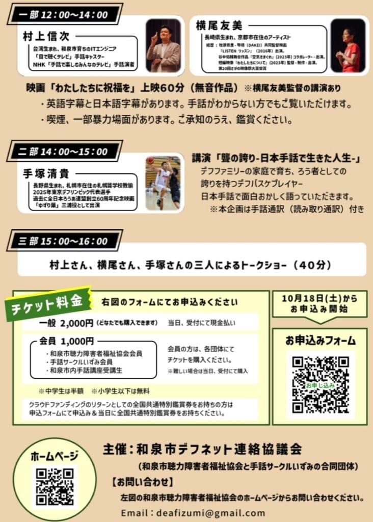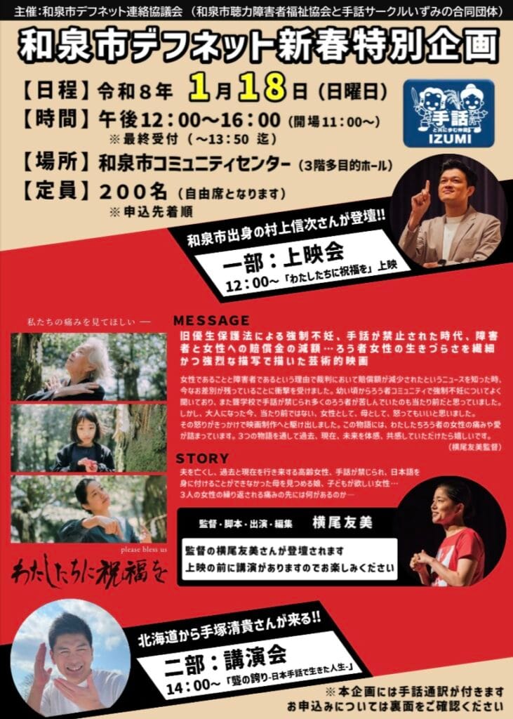 開催日:2026年 1 月 18日(日曜日) 時 間:午後12:00~16:00(開場11:00~) 場 所:和泉市コミュニティセンター 3階多目的ホール deafizumi@gmail.com のメールアドレスを受信できるようにしてくださ...