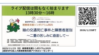 情報共有被害者支援シンポジウム2025 井出様ご講演動画 大聴協事務局からの情報です。 11月23日に認定NPO法人大阪被害者支援アドボカシーセンターが主催した「被害者支援シンポジウム2025」の動画(YouTube)をお送りします。内容は、生野ろう学校児童事故裁判について、井出様よりお話いただい... 2025.12.09情報共有