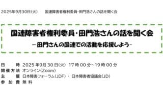 情報共有9/30(火) 国連障害者権利委員・田門浩さんの話を聞く会 大聴協事務局からの情報です。連盟より「国連障害者権利委員・田門浩さんの話を聞く会」の案内がありました。申し込み方法はフォーム・メール・FAXで直接申し込んでください。--------------開催日時: 2025年9月30日(火) 17時... 2025.09.12情報共有